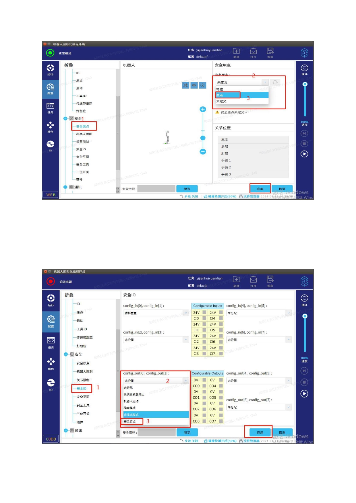 最后在【配置】【安全】【安全 IO】中选择可配置输出 IO,选择其中一组信号,然后配置成需要的安全原点信号,这样就可以机器人处于原点位置时,可以在可配置 IO 输出的端口读到输出信号。
