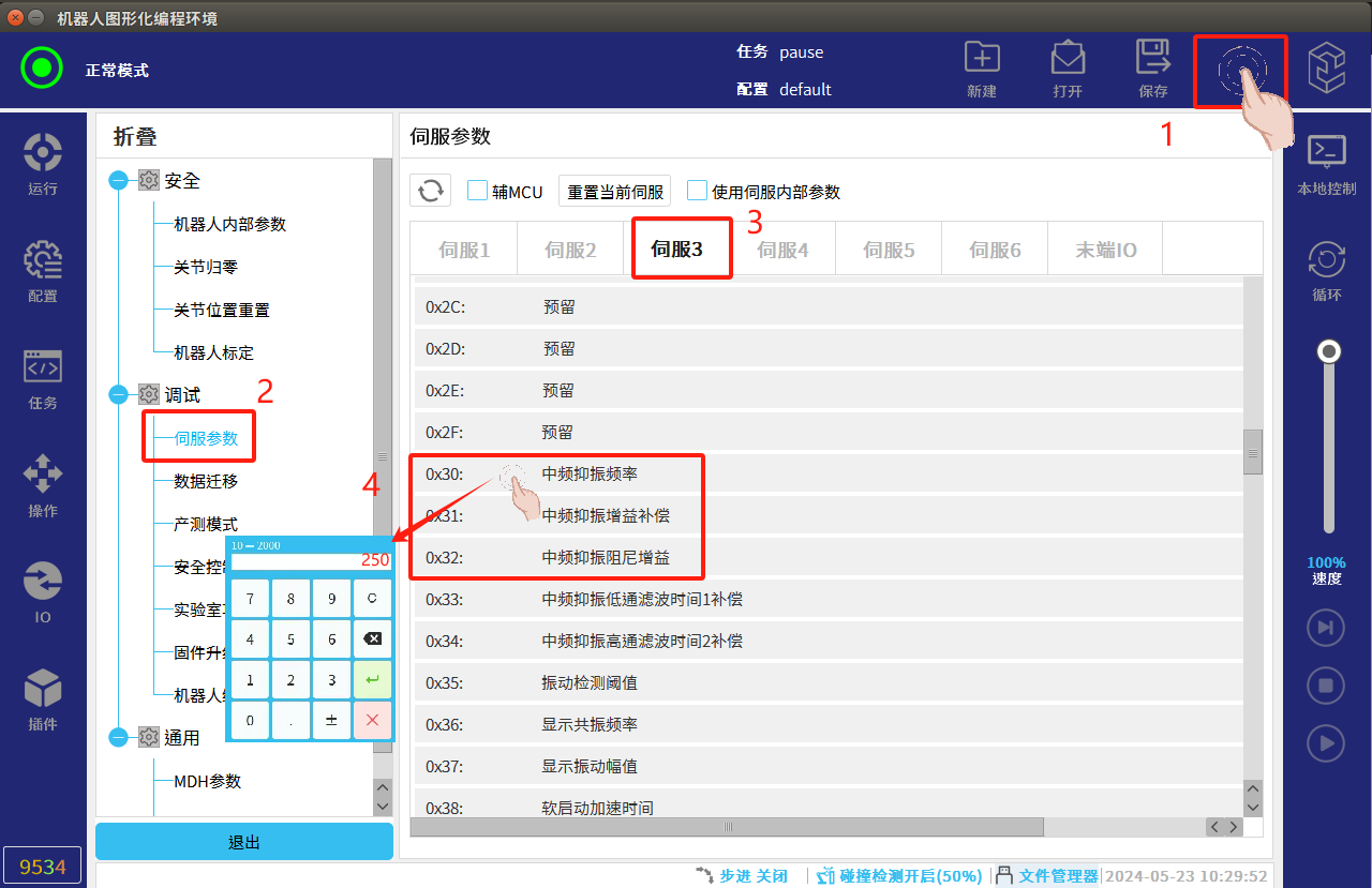 通常在出厂时,Pn0C 被设定为 0,即标准抑制模式,振动抑制参数均由控制 器下发。在后续使用机器人的过程中,若出厂设定的默认参数对于实际工况下的 抖动抑制能力达不到特定需求时,则可通过调整伺服参数Pn0C 进行自动低频抖 动抑制。