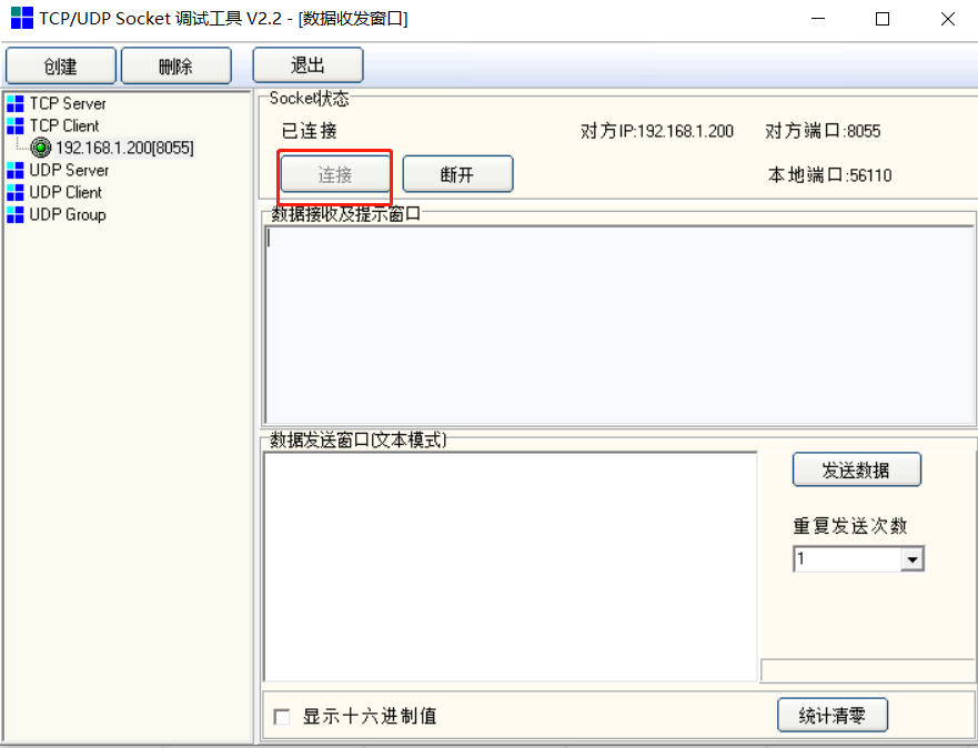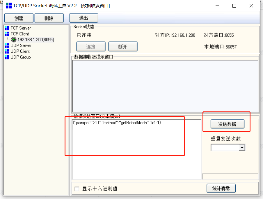 以 socket 助手为例,只需要知道机器人的 ip,端口填写 8055。连接步骤和连接成功后显示如下: