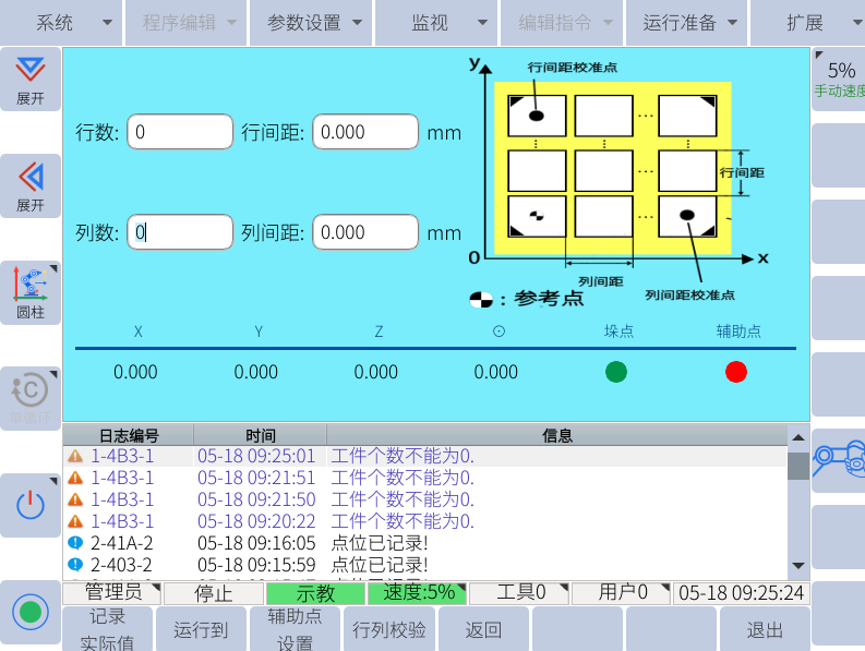 5. 参考点:即托盘上第一个工件的摆放位置,以后每个工件的坐标以其为基准进行偏移计