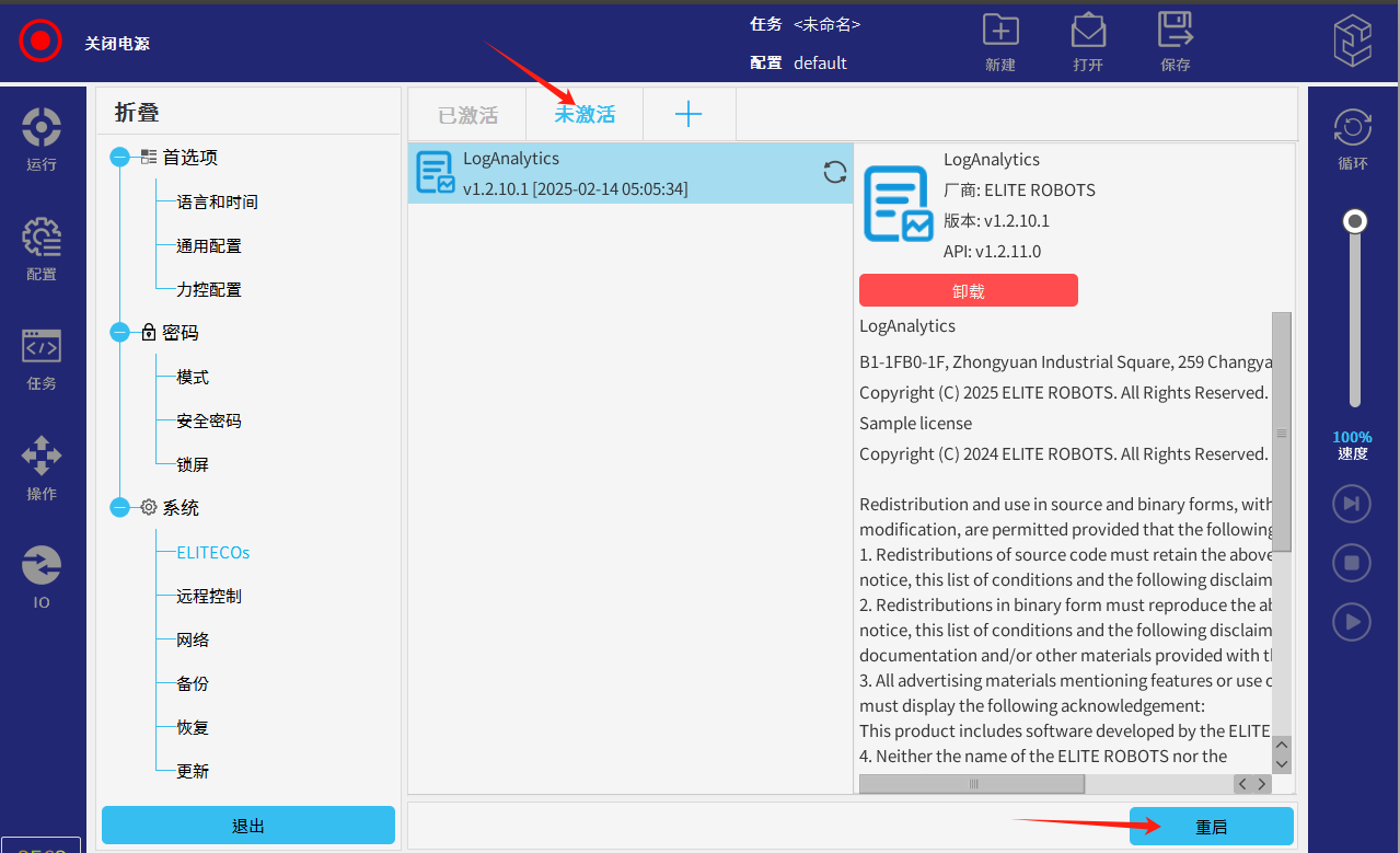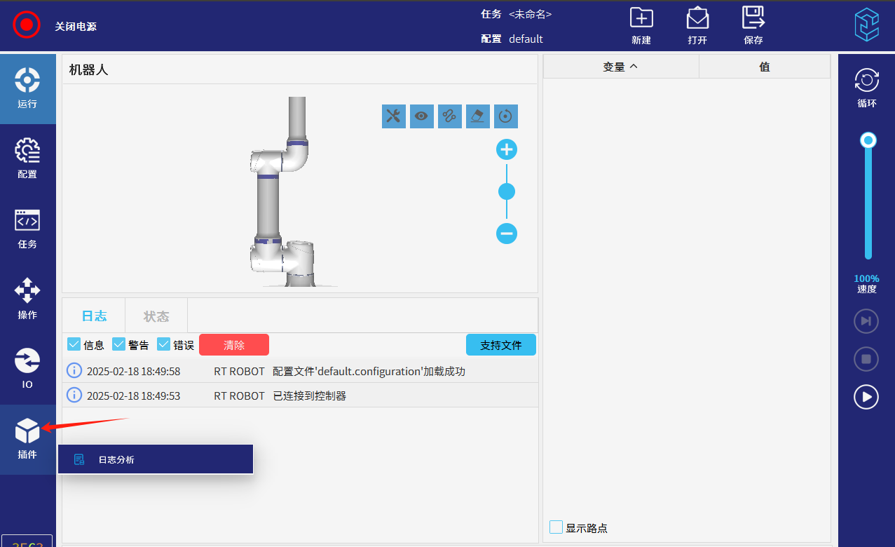 ● 点击示教器屏幕左侧底部插件按钮,再点击“日志分析“进入插件界面