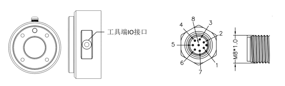 在机器人末端的工具法兰旁边有一个圆柱形金属旋钮,取下旋钮可看到 8 针连接器,该连接器可通过IO,模拟量,485等通讯方式为连接到机器人末端 IO 的夹持器、传感器等设备提供电源和控制信号。