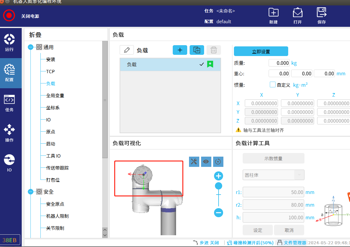 第七步:按下示教器顶部自由拖动按钮,机器人末端三色灯亮蓝灯且机器 人没有动或者有一点微动那就说明负载以及重心就设置正确;如 果机器人往下掉或者往上抬那就说明质量没有设置正确,如果机 器人往X,Y,Z三个方向的某一个方向偏那就说明重心没有设置正确。