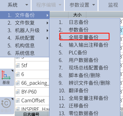 点击:系统--文件备份,列表中1-13可以按需求备份