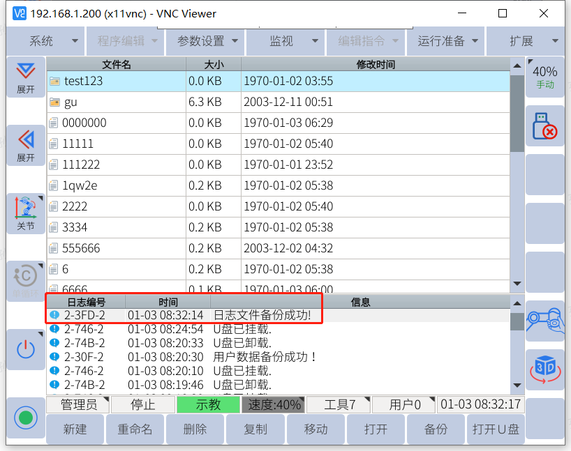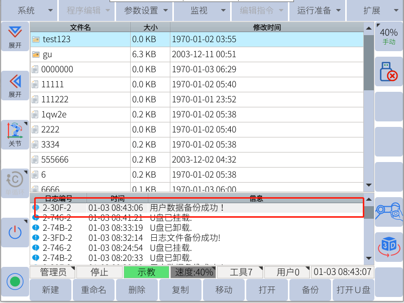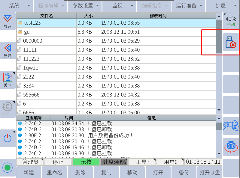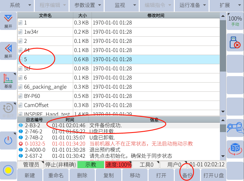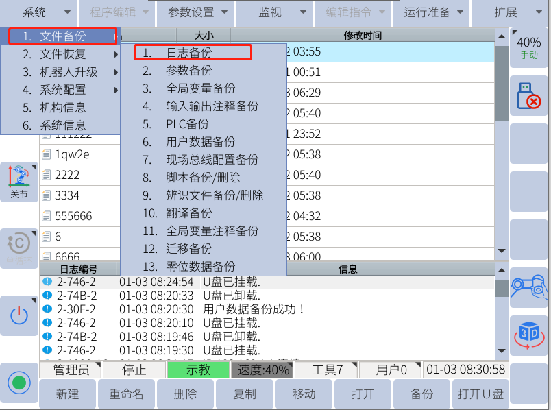 注:只有示教器上显示u盘图标的时候才能用来备份和恢复(导入导出相关数据)