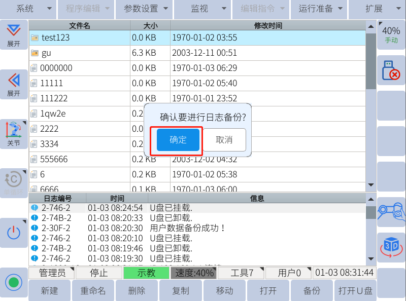 在u盘插好的情况下,点击:系统--文件备份--日志备份--确认