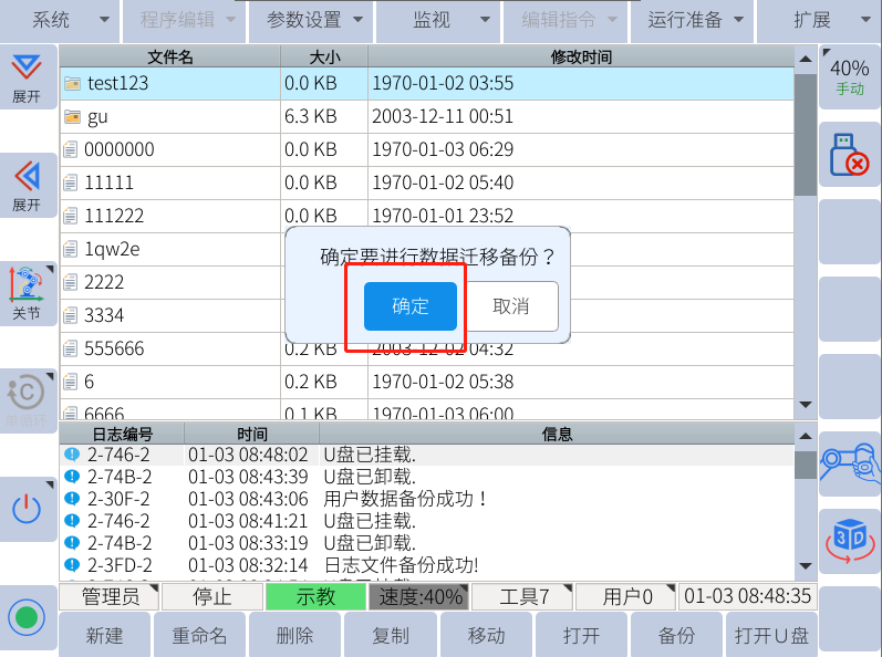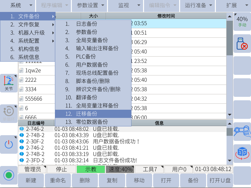 迁移备份一般在需要更换控制柜的情况下使用,会备份出所有的机器人文件包括机器人的零位dh等,需要注意不能和用户数据备份弄混!
