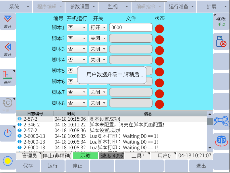 用户数据备份可备份出所有jbi和lua文件,也包括用户plc,全局变量及注释等;一般复制一台机器人应用的程序到另一台机器人的时候,可以使用用户数据备份;