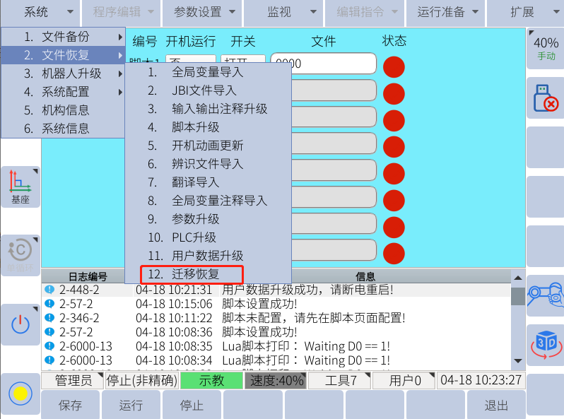 迁移恢复一般在需要更换控制柜的情况下使用,会备份出所有的机器人文件包括机器人的零位dh等,需要注意不能和用户数据恢复弄混!否则会出现丢失零点等不可挽回的问题!(迁移只能在同台机器人内进行,,不同台机器人,不能迁移恢复)