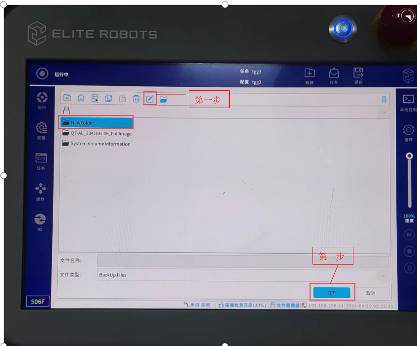 第一步:将A本体的出厂备份文件存放在 U盘,将U盘插入示教器USB口。(出厂备份 文件请咨询米兰·(milan)中国技术提供)