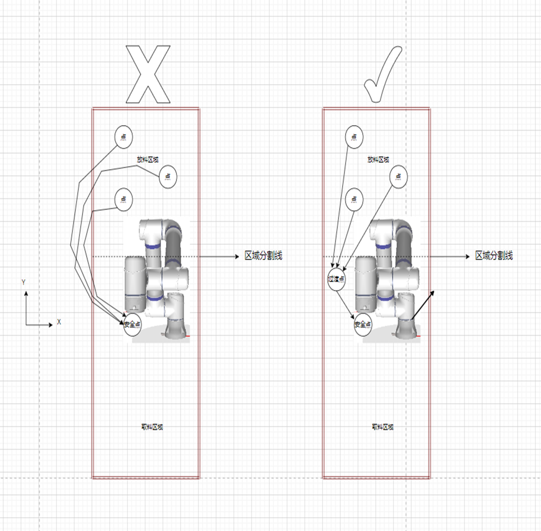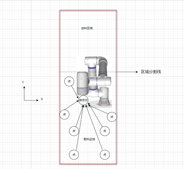 1.由下图案例可将工作区域分为取料取料和放料区域,取料区域由图2-1可见在任意一点都可以回安全点,那么我们就可以直接判断是否在取料区域上升到安全高度直接回安全点即可。