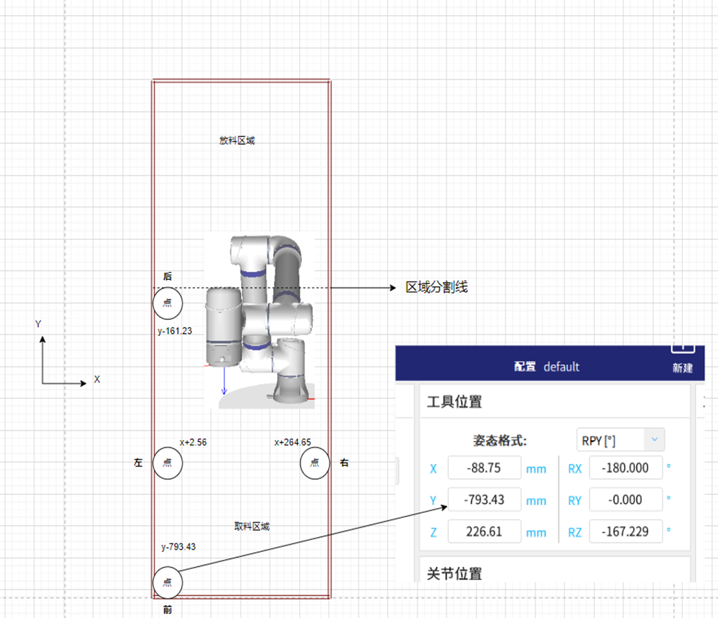 2.需要手动移机器人取料区域最左端(+X方向)点,最右端(-X方向)点,最后端(+Y方向)点,最前端(-Y方向)点,记住这四个点的x,y最大值和最小值程序判断区域时需要用到,移哪个方向看哪个方向的值,如图2-2。