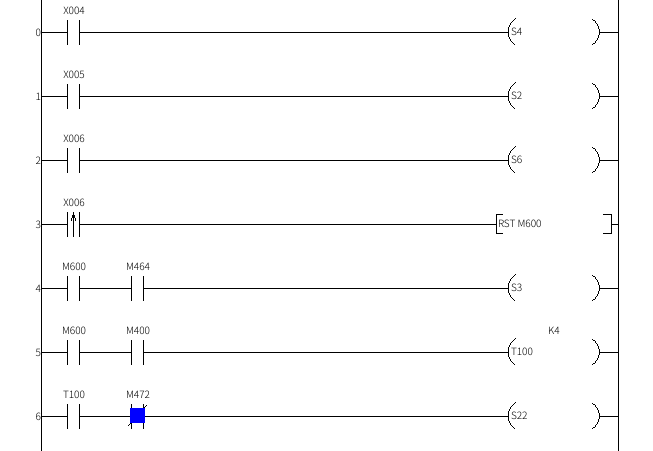 第 0 行:按下启动按钮(X004)为“1”M601有信号,M601关联启动S1。